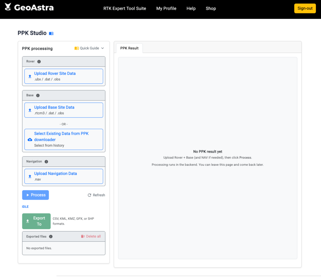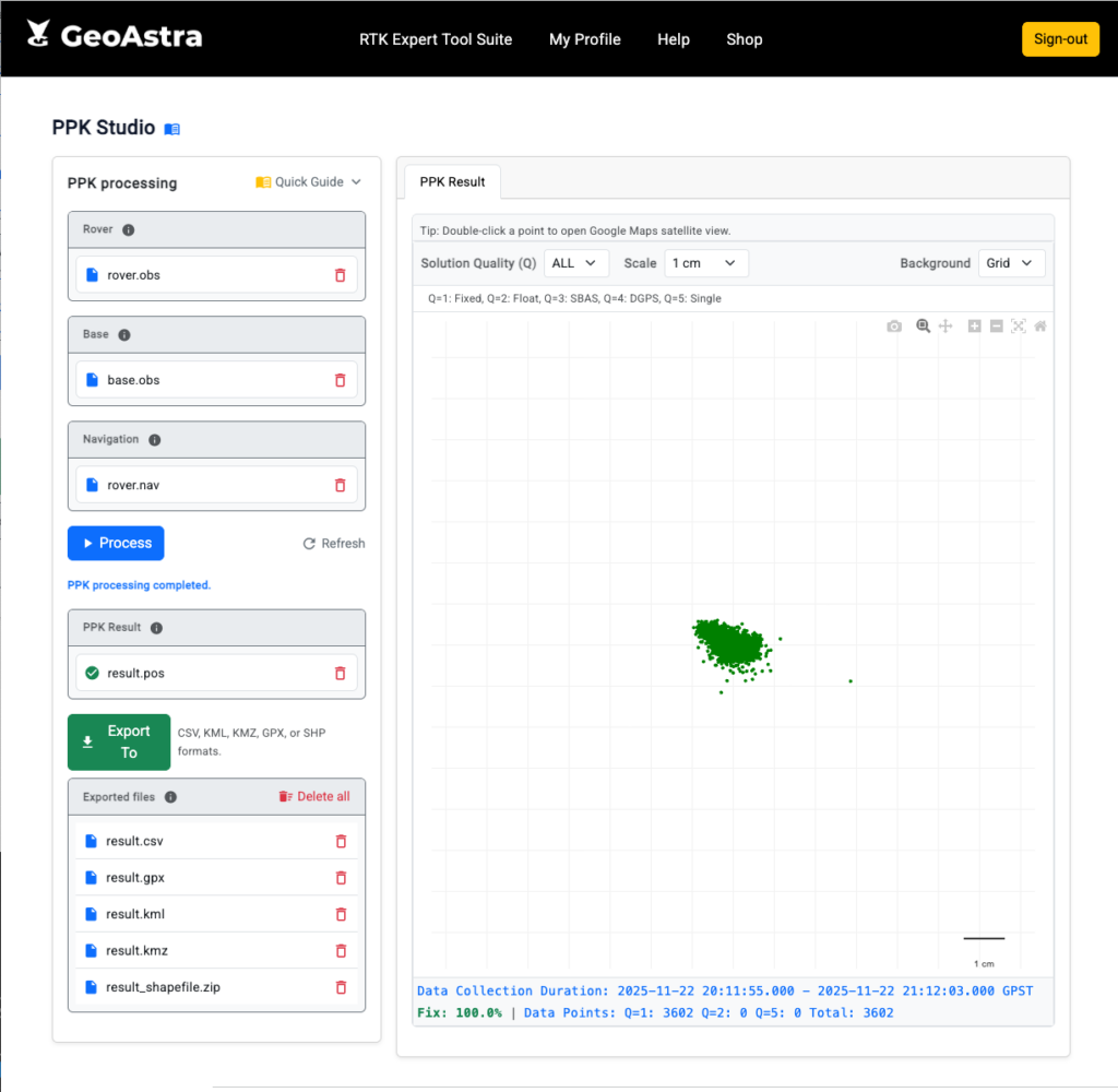 PPK Studio is a web-based PPK (Post‑Processed Kinematic) tool. You upload Rover/Base data (and Navigation if needed). The system converts raw files to RINEX in the backend, runs PPK processing, generates result.pos, and visualizes the solution on the plot. You can also export the result into multiple formats.