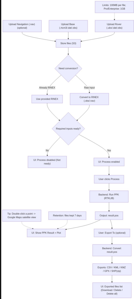 Supported: .nav> Note: If you upload raw files (e.g., .ubx/.dat/.rtcm3), PPK Studio converts them to RINEX (.obs / .nav) automatically in the backend. If your Rover input is already RINEX .obs, you may need to upload the corresponding .nav file.