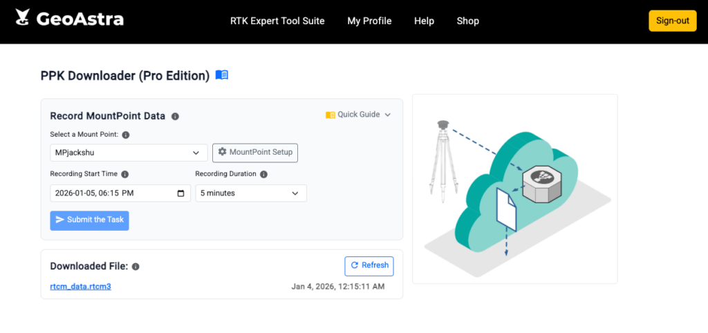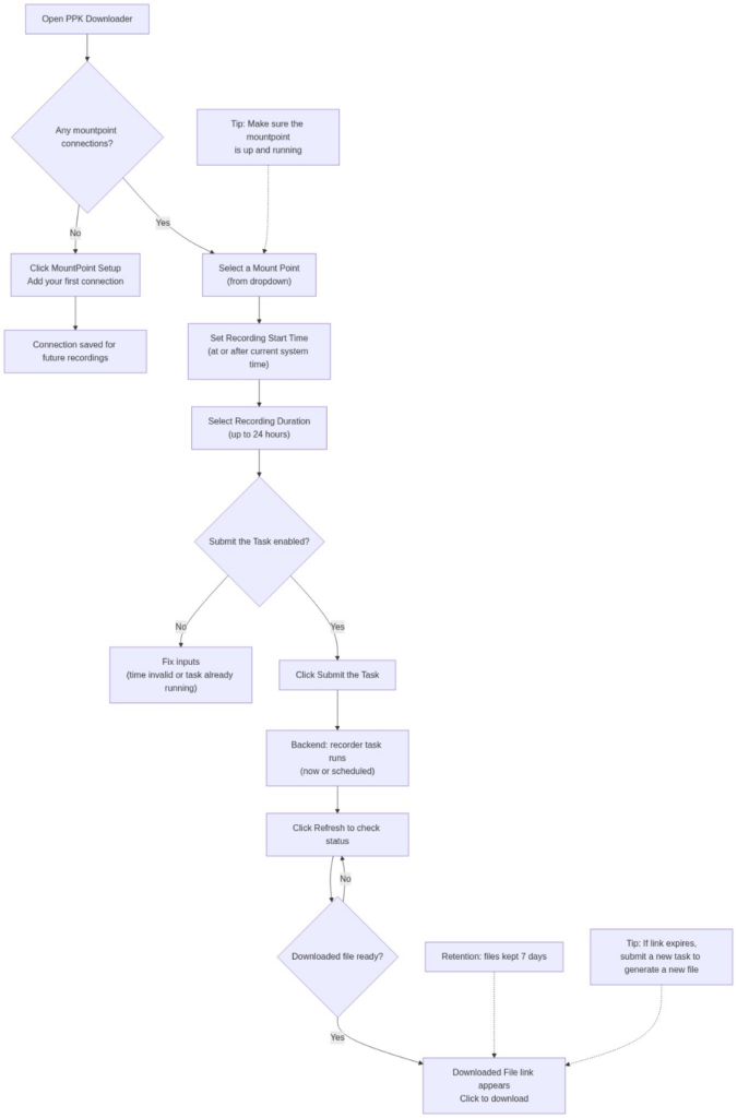 PPK Downloader simplifies PPK (Post‑Processed Kinematic) workflows by downloading RTCM base correction data directly from your NTRIP mountpoint.You don’t need to set up and maintain a physical base station for PPK—capture Rover data in the field, then retrieve base RTCM data later from your mountpoint.It supports up to 24 hours of continuous recording and stores files securely in the cloud for 7 days. You can record immediately or schedule a recording for later.