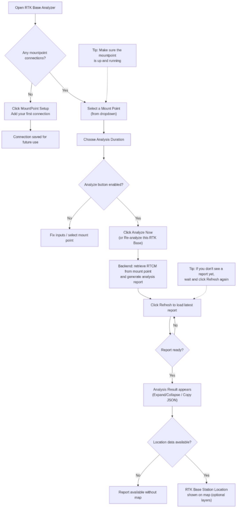 - Click Analyze Now (or Re-analyze this RTK Base) to start the backend analysis task.